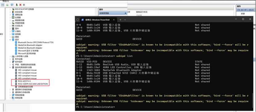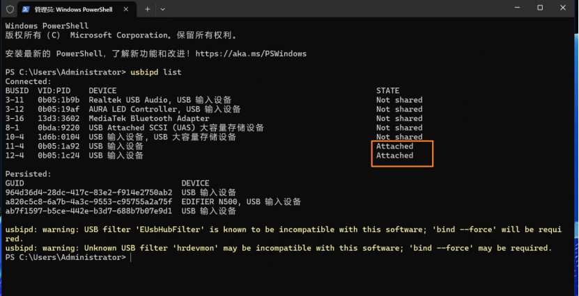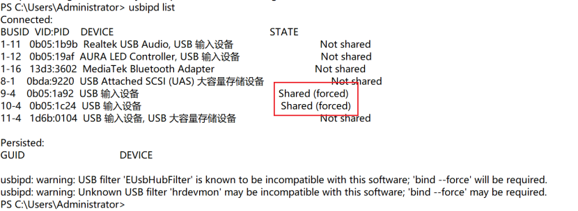 确认与列表的VID-PID匹配了以后我们做直通流程,部分有提示reboot字样是需要重启宿主机才能生效的,这个需要留意字样,像我直通了usbipd bind --busid=9-4 --force,下面就提示reboot字样是需要重启宿主机的。